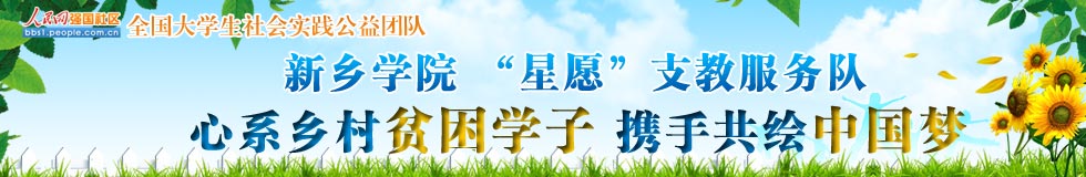 2013年6月29日,“星愿”義務支教服務隊25名隊員分別到封丘縣應舉鎮(zhèn)付里莊小學、丁寨小學。在這兩所小學,和孩子、村民一起度過了難忘的兩周暑期時間。期間、他們主要開展了暑期作業(yè)輔導、英語、成語(故事)、國學、音樂、口才、美術(shù)、體育、舞蹈、手語、手工、勵志講學等課程...詳情>>> 自6月30日開始,“星愿”支教服務團在封丘縣應舉鎮(zhèn)丁寨小學和付里莊小學開展了兩周的支教活動。