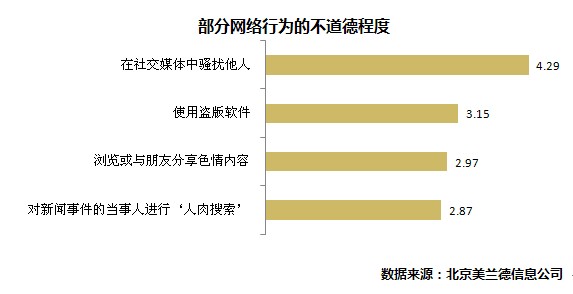 哪些行為在網絡世界中最不道德?調查顯示,“在社交媒體中騷擾他人”被認為最不道德;其次是“使用盜版軟件”;“瀏覽或與朋友分享色情內容”以及“對新聞事件當事人進行人肉搜索”這兩項行為被認為處于“一般”和“輕微不道德”之間。