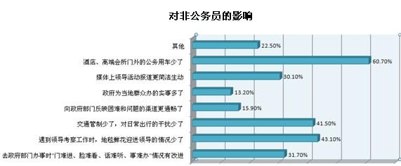 截至2013年12月20日10時,共收到網絡問卷2442份,48.4%的受訪者認為“八項規定”對個人生活有影響,其中公務員群體認為“八項規定”帶來的最大影響是“公務吃請少了,能抽出更多時間陪伴家人”和“津貼補貼獎金少了,勒緊褲帶過日子”,非公務員群體認為“八項規定”帶來的最大影響是“酒店、高端會所門外的公務用車少了”和“遇到領導考察工作時,地毯鮮花迎送領導的情況少了”。