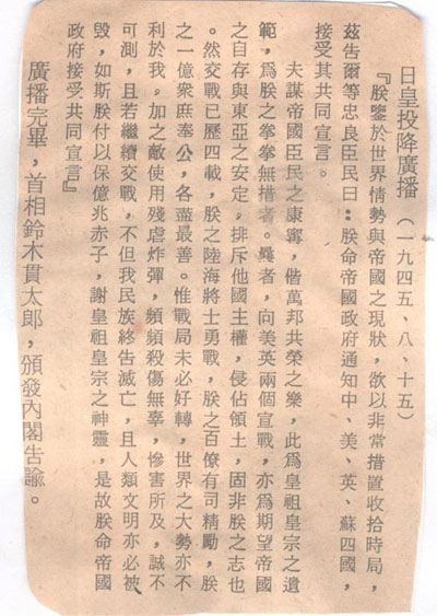 1945年8月15日日本天皇投降廣播詞。這篇文告是告訴自己的老百姓(忠良臣民)的。其中對于發動戰爭的罪責不但沒有一個字的自責,而且指“敵使用殘虐炸彈,頻頻殺傷無辜,慘害所及,誠不可測。”和十余年后所發現的東條英機遺囑的惡劣態度如出一轍。廣大網友不放回頭看看2013年12月12日18:21:31《歷史鐵證日本400年侵華野心,讓我們恨搗靖國神社內幕吧!》一文中東條英機的遺囑。
