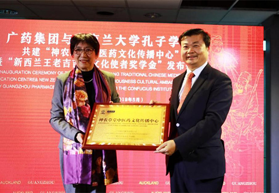廣藥集團向奧克蘭大學孔子學院授予“神農草堂中醫藥文化傳播中心”牌匾,寓意雙方將共同推廣中醫藥文化